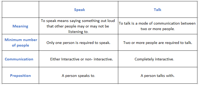 In addition, the difference between the two words extends to their usages, regardless of a number of participants. Talk is used to describe non-formal communications. Speak is used to refer to more serious or formal interactions.